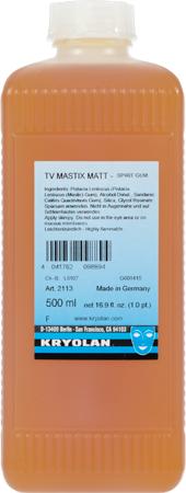 TV Spirit Gum is a make-up artist’s adhesive, especially for adhering hair, beards, and wigs. The special mixture of natural resins of TV Spirit Gum means that, after it dries, it appears more matt and more natural on the skin than does normal Spirit Gum. Apply TV Spirit Gum to the required area of skin and allow it to dry somewhat. Then press on the object to be adhered. MME Mild Spirit Gum Remover is recommended to remove Spirit Gum from the skin. For removal from lace or tulle, or from non-human surfaces, use Spirit Gum Remover or alcohol.